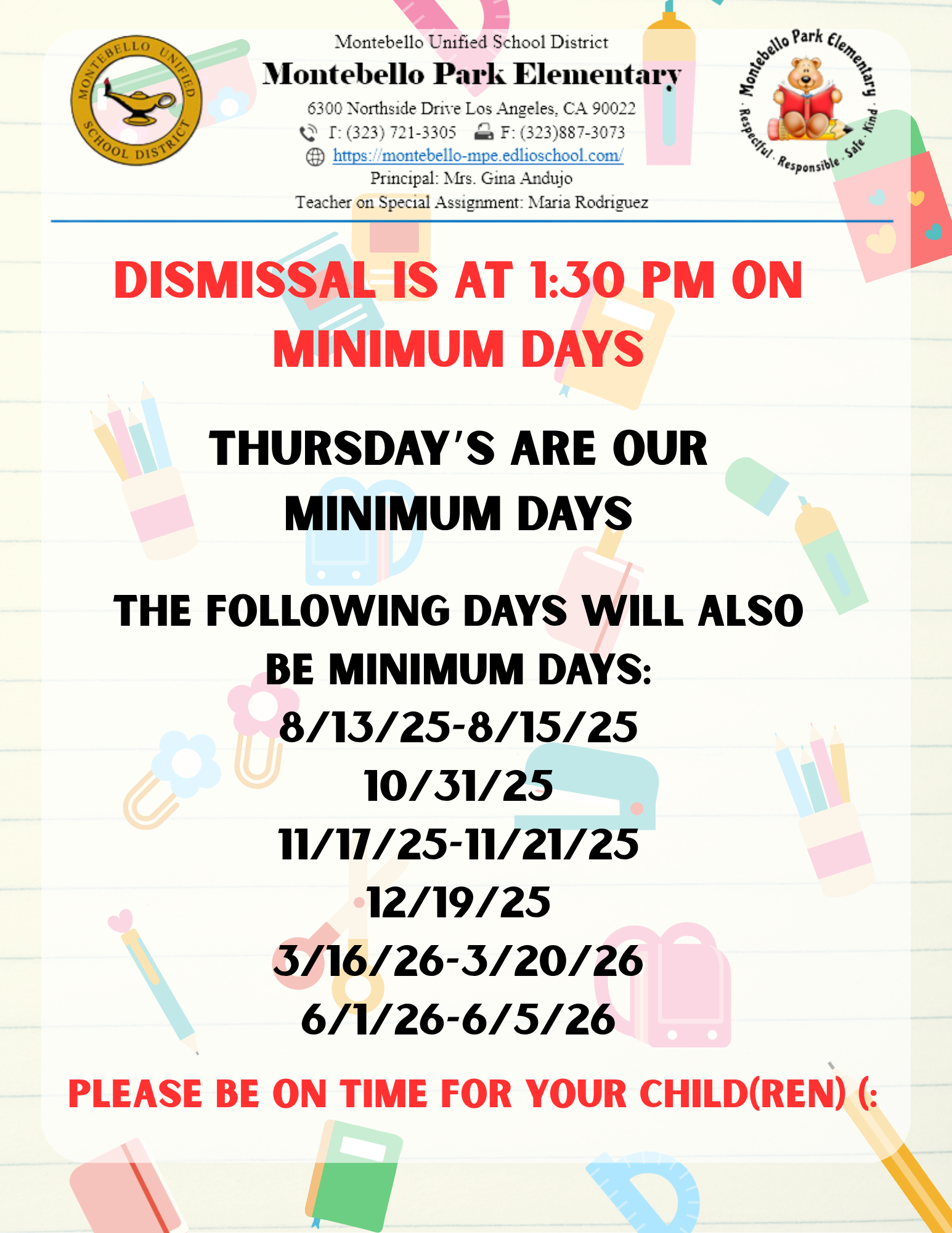 TK-5th Grade School Day is from 8:20 a.m. -2:33 p.m.